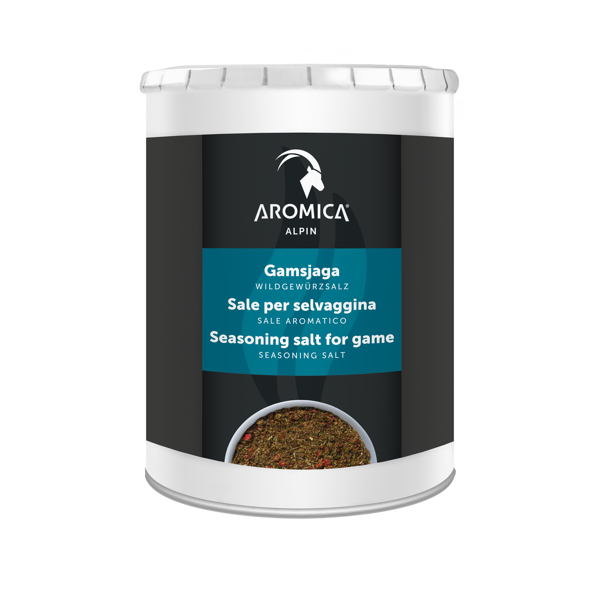 The wild spice salt "Gamsjaga" is a tasteful innovative wild spice salt in an extraordinary composition with a dominant tart note.
