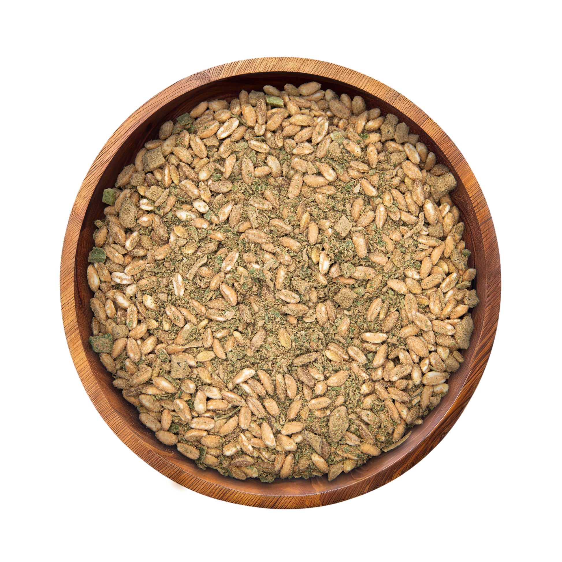 Urkörner (DINKEL, EMMER, URKORN)* 75%, Pilze 10% in veränderlichen Gewichtsanteilen, (Champignons*, Shiitake*/**, Kräutersaitling*/**, Steinpilze*), Zwiebeln*, natürliches Aroma, Bärlauch*, Petersilie*, Rohrohrzucker*, Gewürze*,
