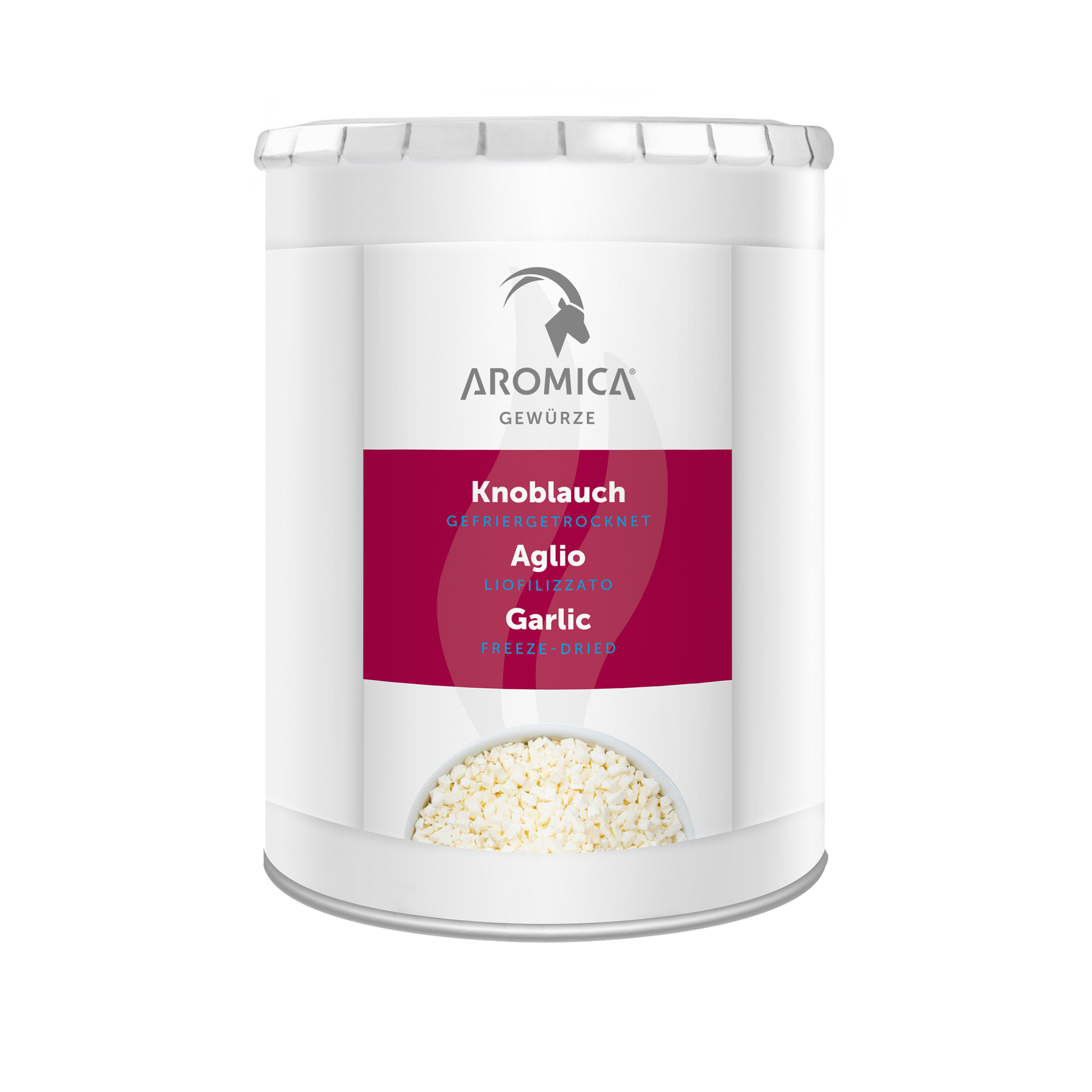 AROMICA® gehackter, gefriergetrockneter Knoblauch bietet den frischen Geschmack und Duft von gerade geschnittenem Knoblauch. Ideal für warme und kalte Speisen, verleiht AROMICA® Knoblauchpulver eine intensive Würze.