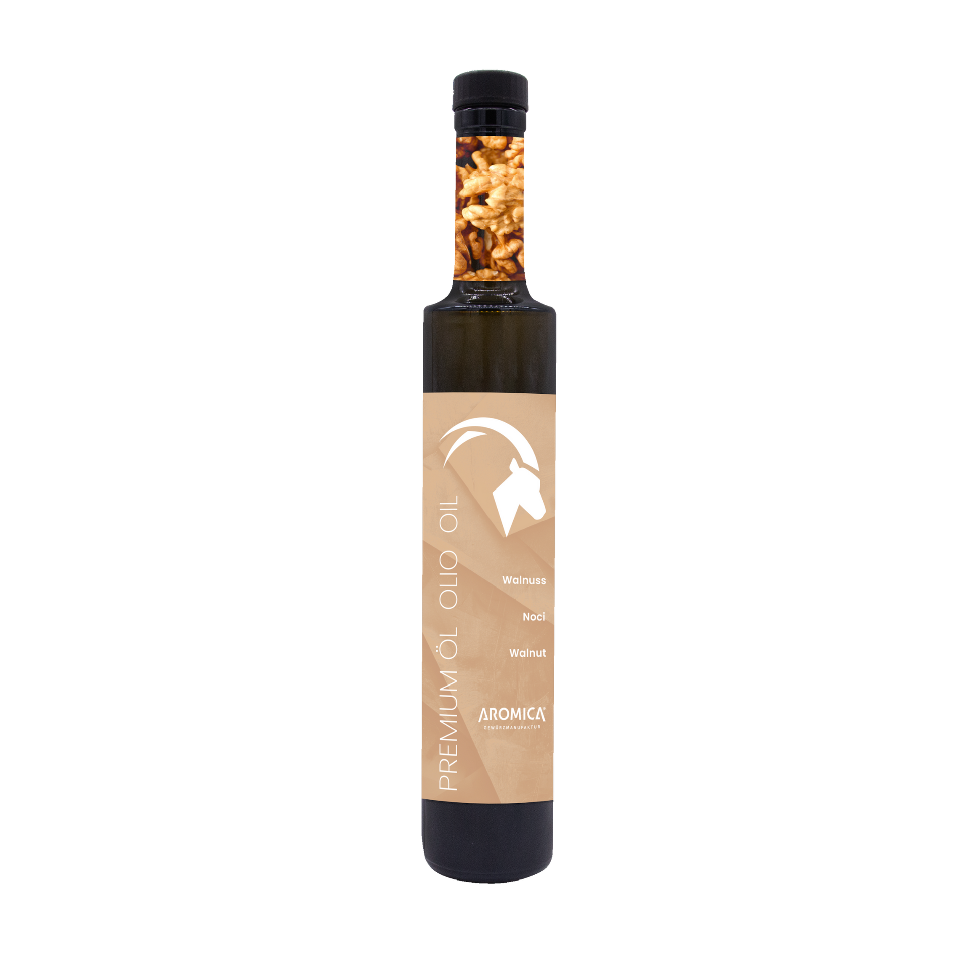 AROMICA® Premium-Öl Walnuss kaltgepresst, eine handverlesene Spezialität aus ungerösteten Walnüssen. Feiner, zarter, charakteristischer Walnuss-Geschmack für diverse Salatvarianten und Fleischgerichte wie Fisch, Geflügel, Wild etc. Aber auch speziell zum Verfeinern und Veredeln in der süßen Küche.